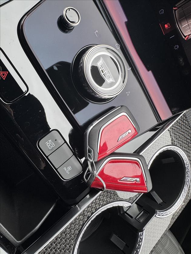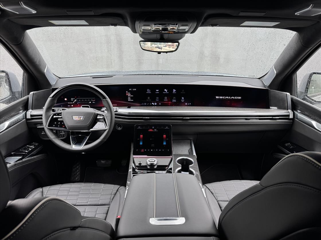 Escalade V е удобен, тих и комфортен до момента, в който натиснете магическия бутон V-Mode на волана. Сега си представете как тази „катедрала на колела“ се ускорява от 0 до 100 км/ч за 4.4 секунди благодарение на 682 конски сили и 885 нютонметра въртящ момент. Нямате време да свалите очи от пътя, за да проследите ускорението? Няма проблем — Head-up дисплеят е пред вас на стъклото. Трудно ви е да си го представите? Заповядайте при нас и се убедете сами! Не се безпокойте, AWD системата се грижи да имате сцепление постоянно, а в различните режими Escalade V определя колко от огромната мощност да отива към задните и предните колела. В режим Sport по-голямата част отива съответно към задните гуми. Адаптивното Air Ride окачване осигурява стабилност. Впечатление правят огромните 16.1-инчови дискове на спирачната система Brembo с червени апарати, които се грижат този гигант да спира също толкова добре, колкото ускорява. V-емблеми на багажника, вратите и волана загатват какво управлявате. Четирите ауспуха също издават „бомбата“, която се крие под предния капак.
