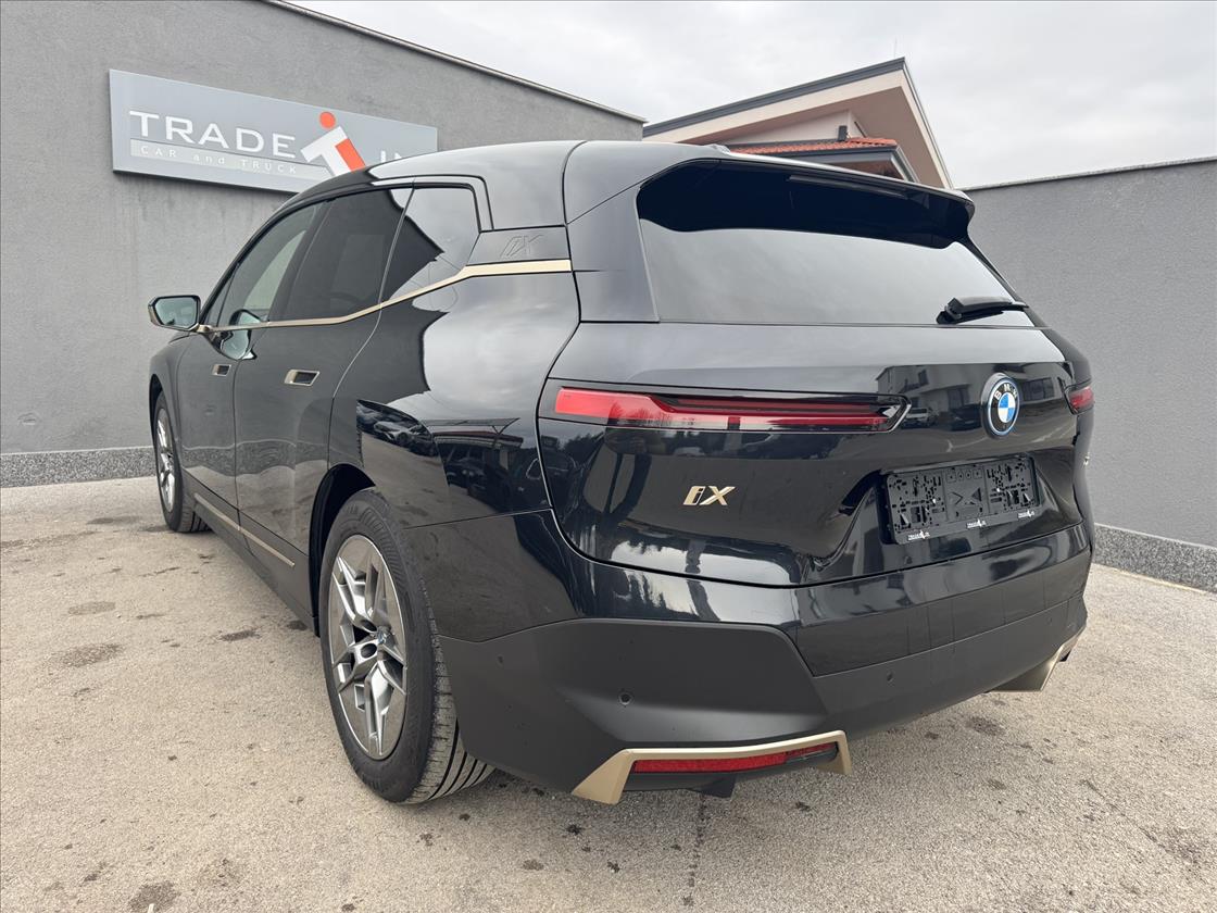 BMW iX xDrive50 съчетава луксозен дизайн с високоефективно електрическо задвижване, като предлага специфични екстериорни акценти в „златисти“ нюанси и оптимизирани летни конфигурации.Въпреки че BMW iX не се предлага в изцяло златист цвят, моделът разполага с пакета BMW Individual Exterior Line Titanium Bronze. Този пакет добавя изтънчени акценти в титанов бронз (който визуално наподобява матово злато) по следните елементи,Рамката и графичните елементи на предната решетка,долната линия на прозорците и дръжките на вратите,логото xDrive50 на задния капак е изпълнено в този бронзов/златист нюанс.Адаптивното двуосно въздушно окачване на BMW iX xDrive50 е проектирано да осигури баланс между максимален комфорт и динамично пътно поведение. То поддържа автоматично нивелиране на каросерията независимо от натоварването на автомобила.